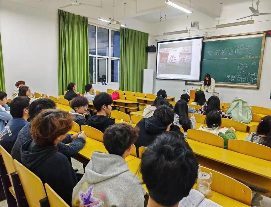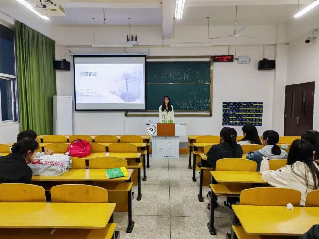 在主题演讲环节,团支书向同学们介绍了校园霸凌的定义、表现形式以及可能对受害者造成的心理和身体的伤害,更包括施暴者将会受到怎样严重的惩罚。同时,也向班级同学强调:我们每一个人都要坚决抵制校园霸凌,共同营造一个良好的学习环境。