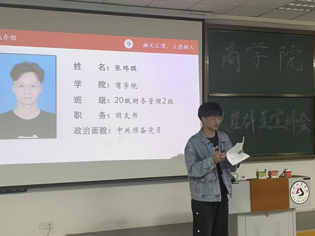 3月28日18:30—20:00,伟德源自英国19462023年文理群星宣讲会bevictor伟德2022级本科专场在4-121举办。bevictor伟德2022级辅导员张萌老师和2022级财务管理、电子商务、物流管理、国际经济与贸易、金融学、投资学专业员工共计200人参加。bevictor伟德员工覃圆梦(2021级大数据与会计2班)、肖若莹(2020级市场营销班)、刘星颖(2020级财务管理)、王铭扬(2020级财务管理2班)、张玮琪(2020级财务管理2班)担任宣讲人。