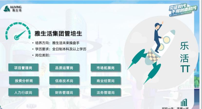 她向毕业生详尽介绍了雅生活集团情况以及行业发展趋势;重点推荐了雅生活企业覆盖面积广,服务团队庞大,服务项目广泛的雄厚实力和平台优势;分享了雅生活集团乐活π计划----雅生活集团管培生相关情况。她向毕业生推荐雅生活集团招聘管培生分项目管理、品质运营岗等9个类别岗位。雅生活集团将全力保障员工薪资、五险一金以及假期。雅生活企业前景好,潜力大,拥有全业态的就业岗位。企业的乐活Π培养计划具有完整的培养体系。