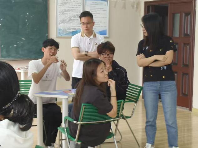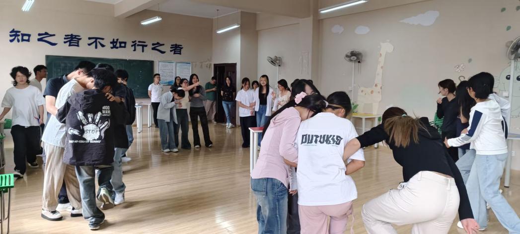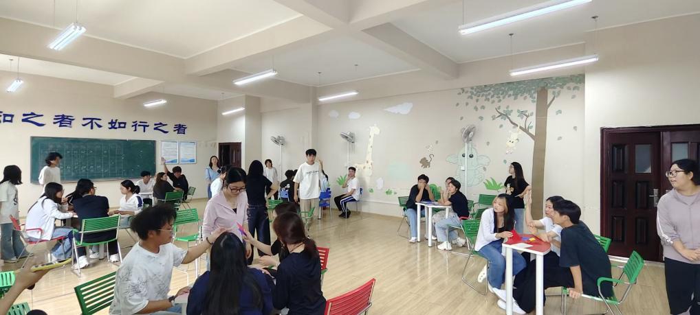 活动在轻松有趣的“报团数脚”热身游戏中拉开序幕。随指令响起,新生们在宽敞明亮的教室内围成圆圈,迅速组队、默契配合。原本略显拘谨的同学,在一次次的互动协作中逐渐放松,欢声笑语不断,初见的陌生感在轻松愉快的氛围中悄然消散。老师们在一旁静静观察,看着这群充满朝气的新生们快速融入,脸上也露出了欣慰的笑容。