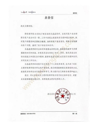 在表扬信中写到吕晶晶同学专业知识和技能十分出色,能快速灵活的运用所学技能解决工作中遇到的困难。在知道自己的不足后努力掌握新的知识,有很强的责任感和耐心为客户解决问题。工作上认真负责将客户的需求和反馈认真记录并解决始终将客户放在首位,在一次次努力中赢得了客户的信任和好评。