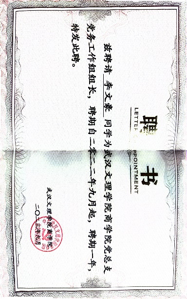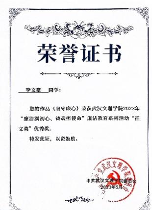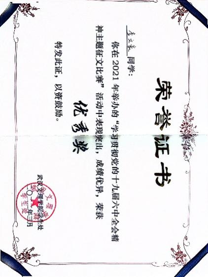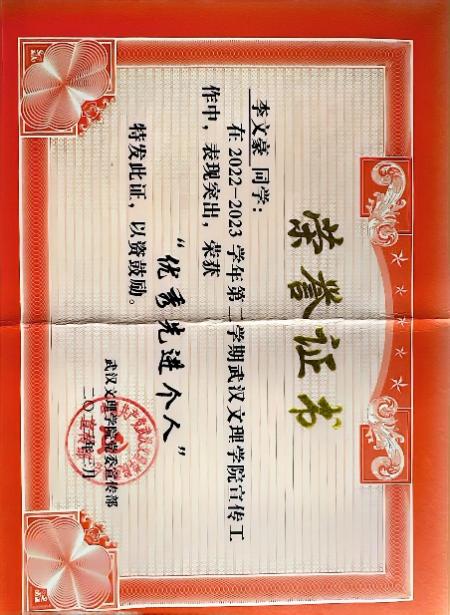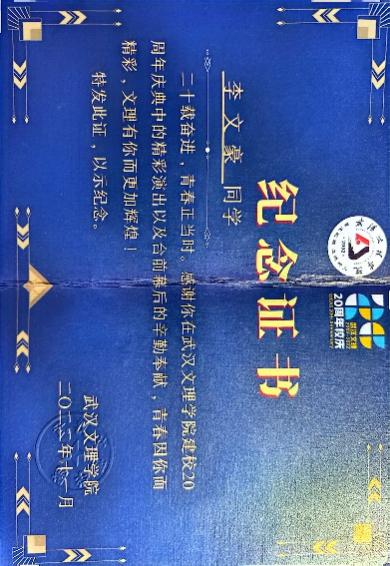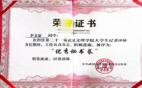 李文豪4次获得“优秀员工干部”、获“优秀员工干部标兵”。在担任21届老员工记者团秘书长期间,参与宣传20周年校庆(独立完成校庆PPT)、文理群星五四表彰、毕业典礼、智能制造与无损检测公司成立等多项活动,获优秀宣传先进个人称号。参与校史编辑,收获20周年纪念证书。