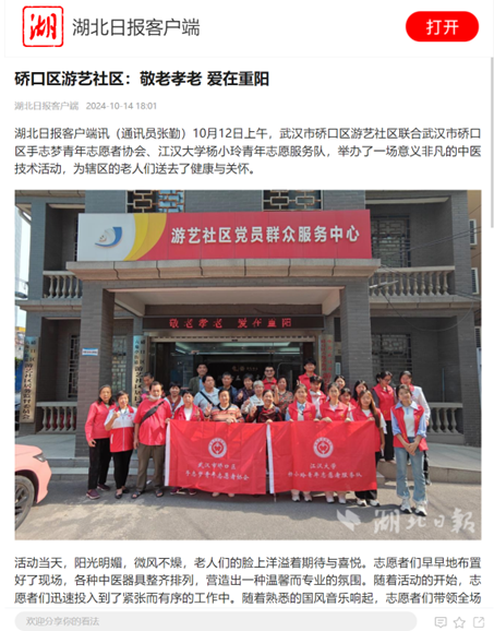 青春奉献,敢为人先,他连续三年在家乡和平村党员活动中心,担任志愿者,参与一线挖沟抗旱工作。在武汉市硚口手志梦青年志愿者协会,助力为聋人朋友打开心结,发布30余篇文章,呼吁公众对残疾人的理解和关爱。今年9月获该单位的表扬信。登湖北日报、孝感日报等主流媒体,曾被孝感市教育局和团委评为“最美孝德青少年”榜首,今年9月底,被孝感日报记者邀请专访,宣传“融文汇理,立德树人”的精神。