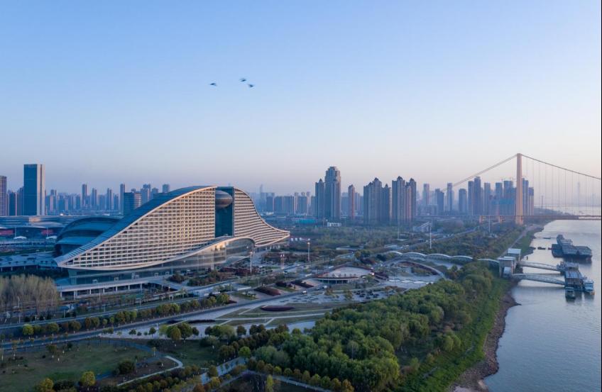 以“水”为设计主题的武汉洲际酒店和武汉国博套房假日酒店,其柔美的曲线建筑形态将水的刚柔并济与周边国际博览新城环形分布的12个矩形展馆完美交融,尽显磅礴气势,成为武汉汉阳新区的耀眼地标。与酒店浑然一体的武汉洲际酒店国际会议中心气势恢宏,建筑面积达10万平方米,采用仿生学景观设计,形似贝壳,新颖独特兼具美感与视觉震撼力。